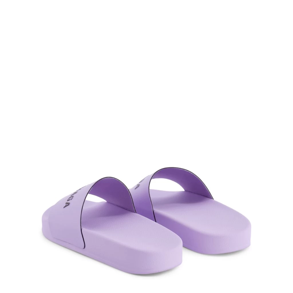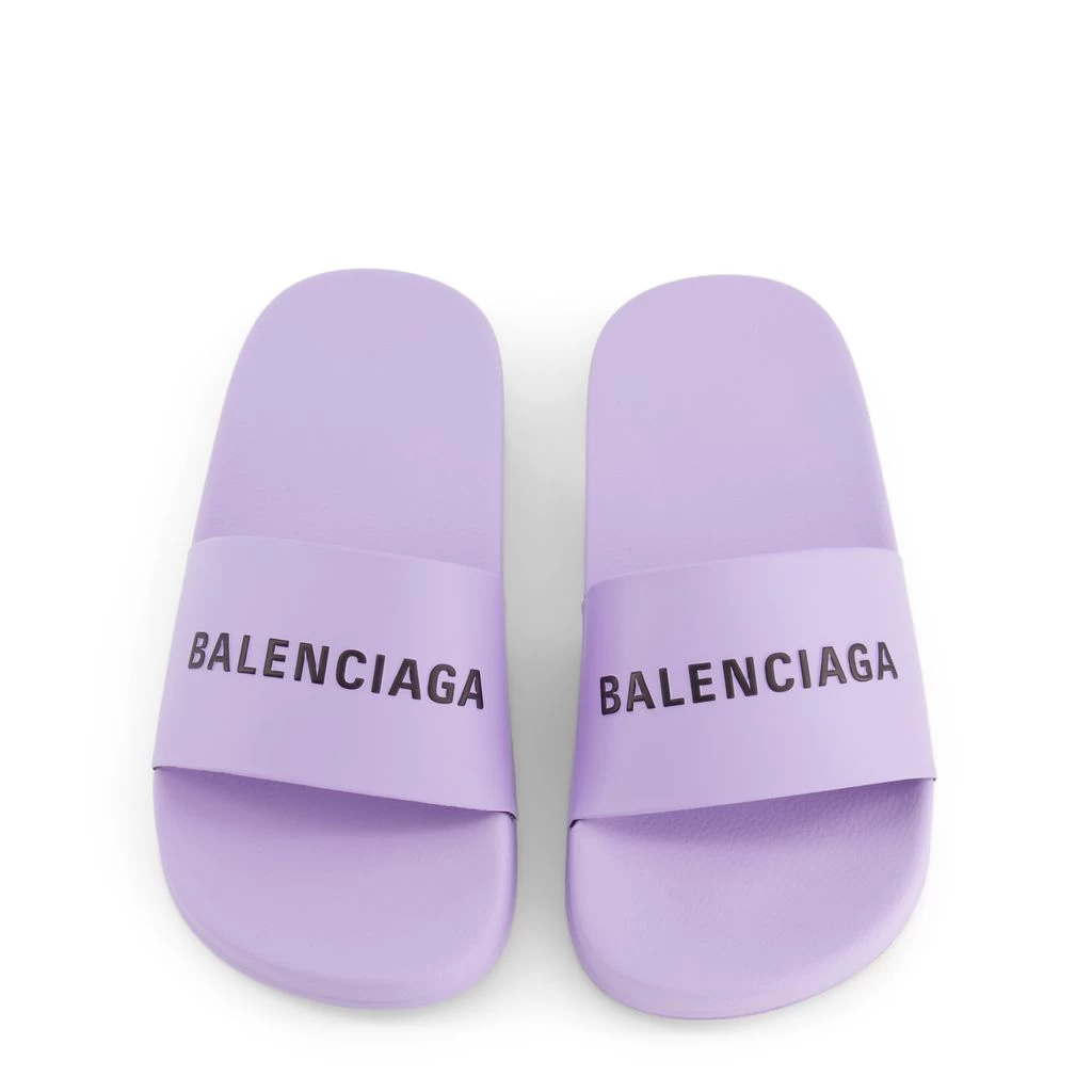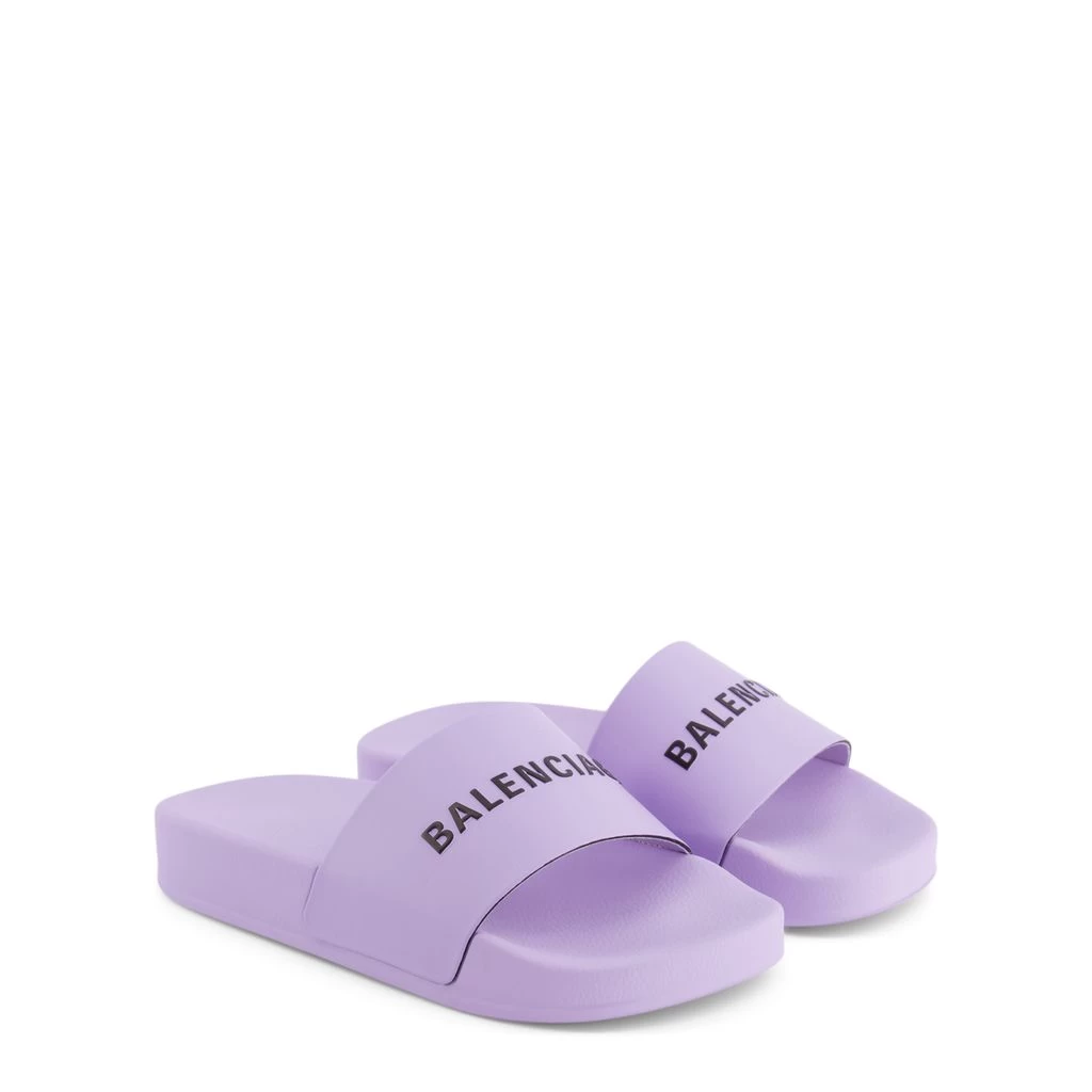 Little feet will be ready for the beach. Purple sandals by Balenciaga. The sandals have a slip-on design.