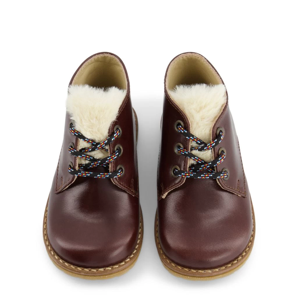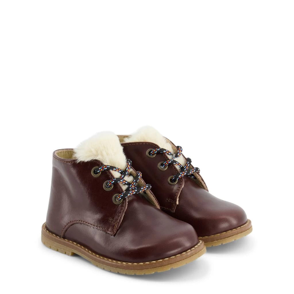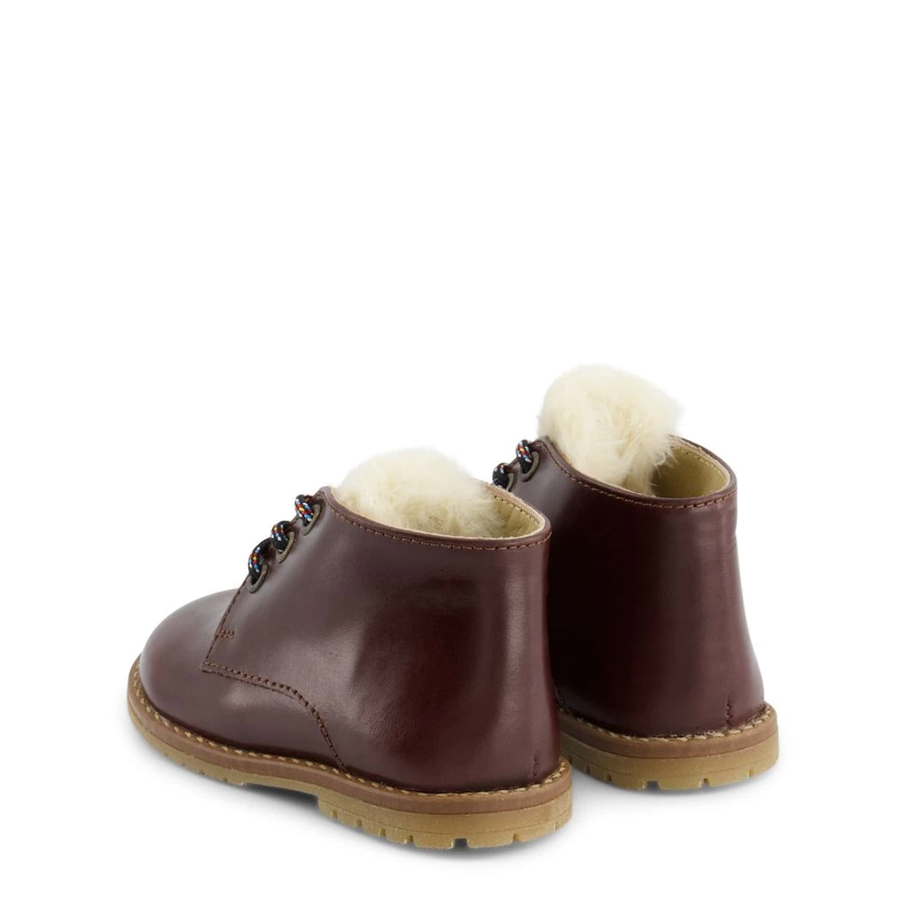 Little feet can walk in style. Brown Litwood shoes by Bonpoint. The shoes are made in Portugal and have a flat lace closure with a contrasting pattern.