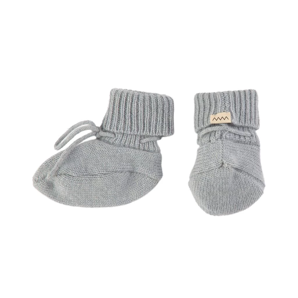 Little feet will be super comfy. Blue melange booties by MarMar Copenhagen. The booties have a knitted design.