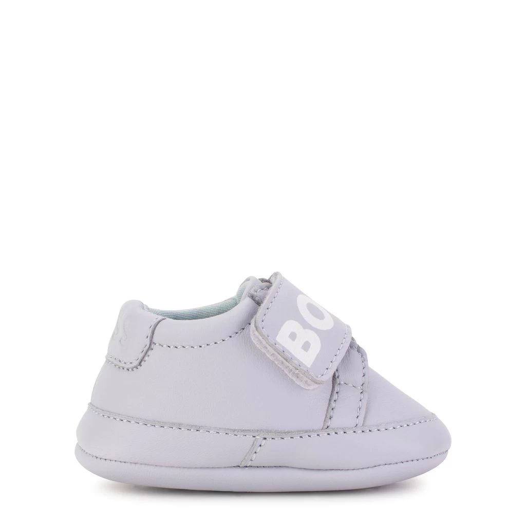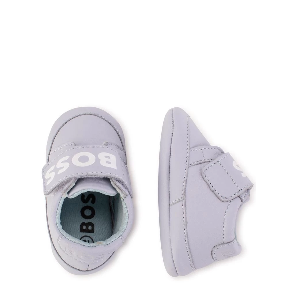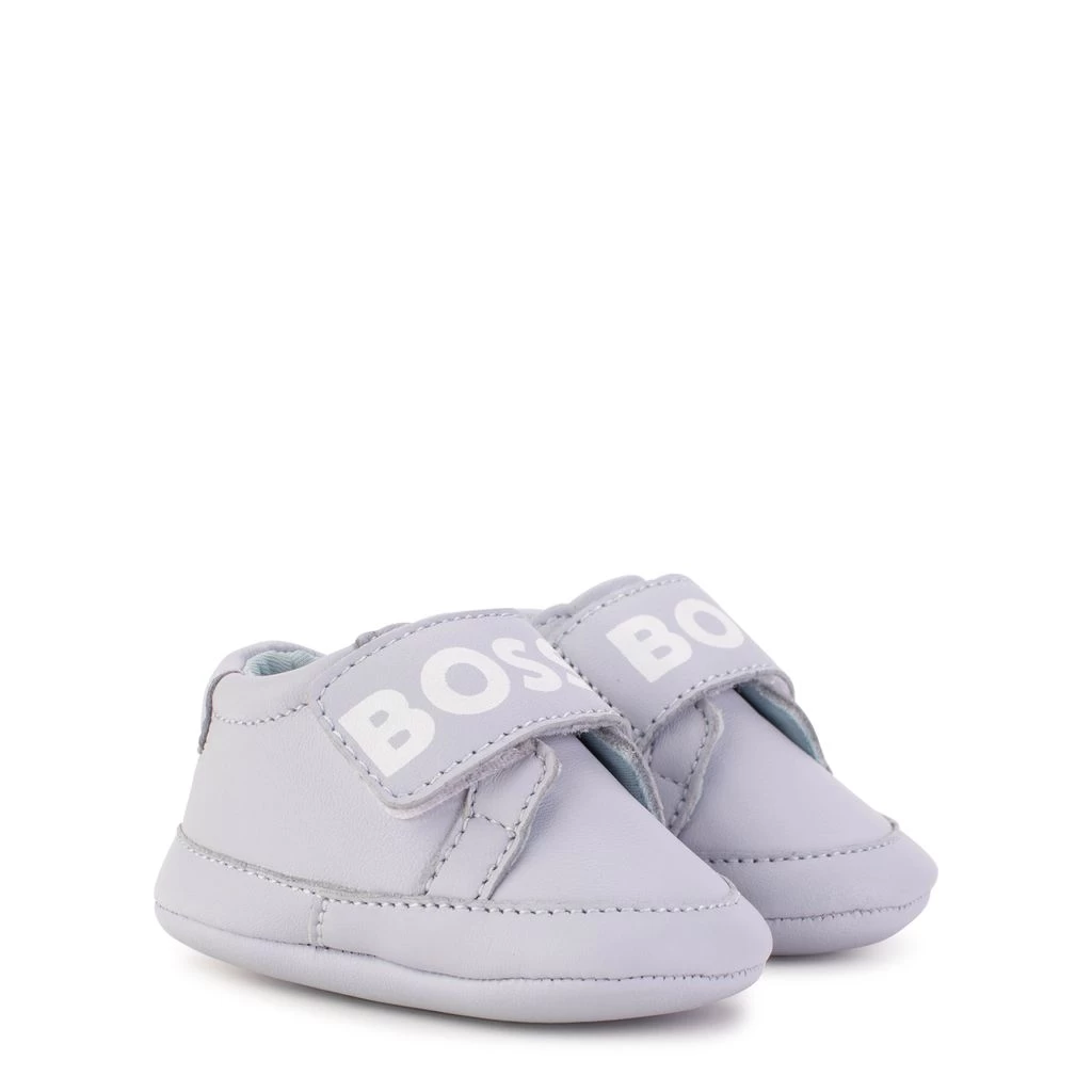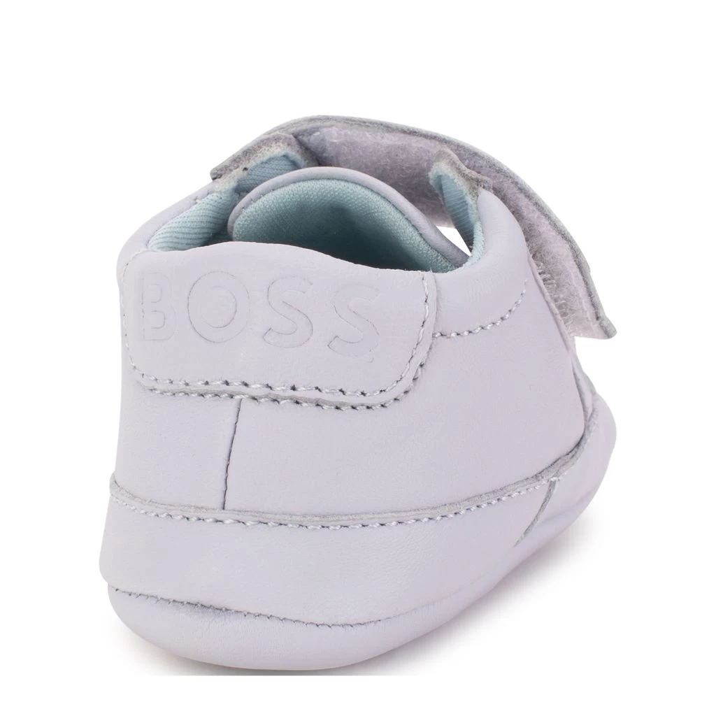 Little feet will be super comfy. Blue crib shoes by BOSS. The crib shoes have a leather upper.
