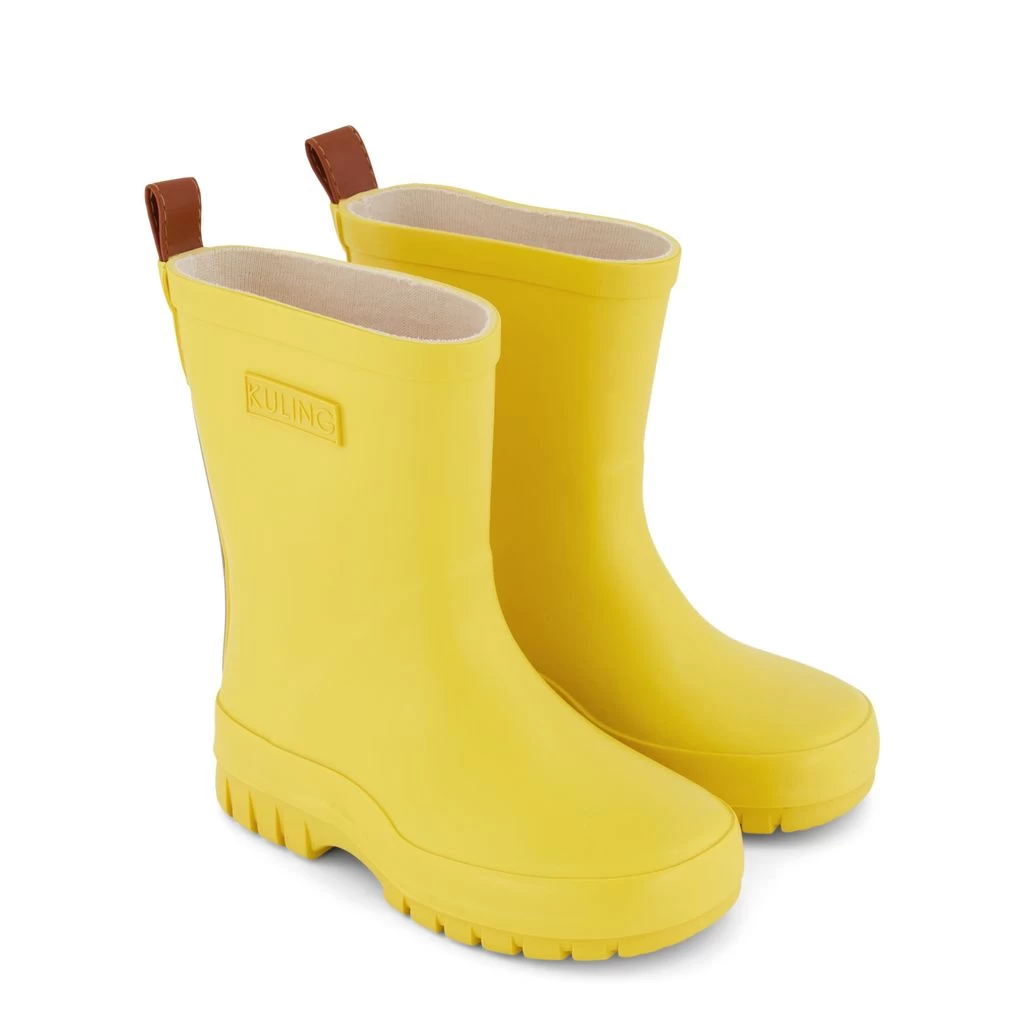 Time to jump through puddles. Yellow Caracas rain boots by Kuling. The boots have welded seams.