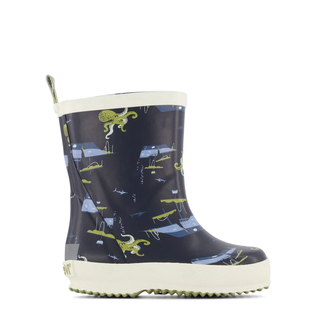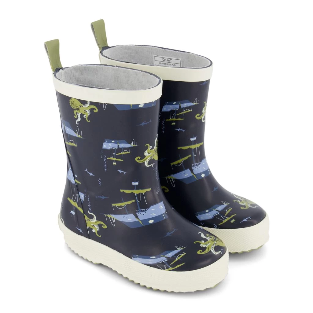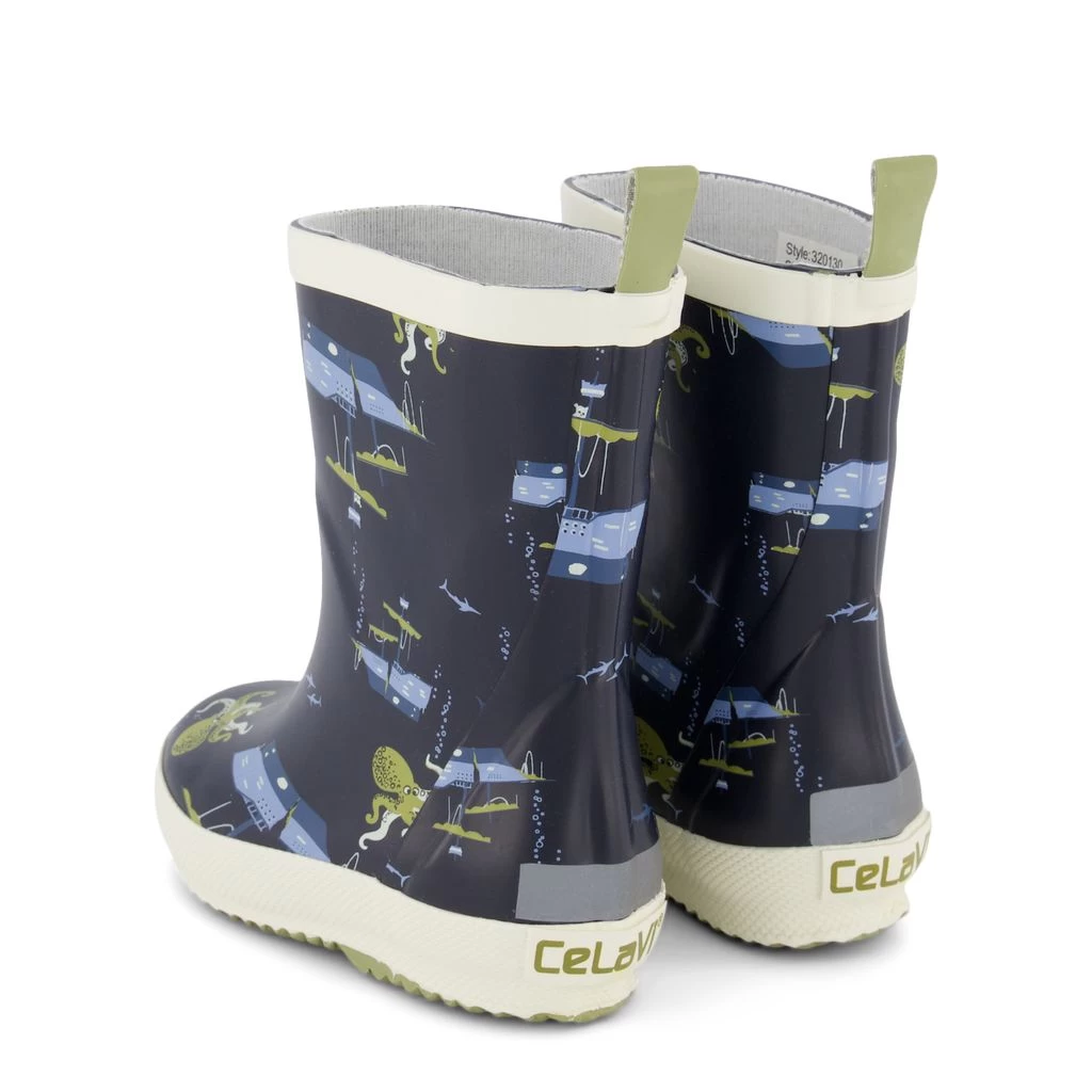Time to jump through puddles. Navy rain boots by CeLaVi. The boots have a handmade design.
