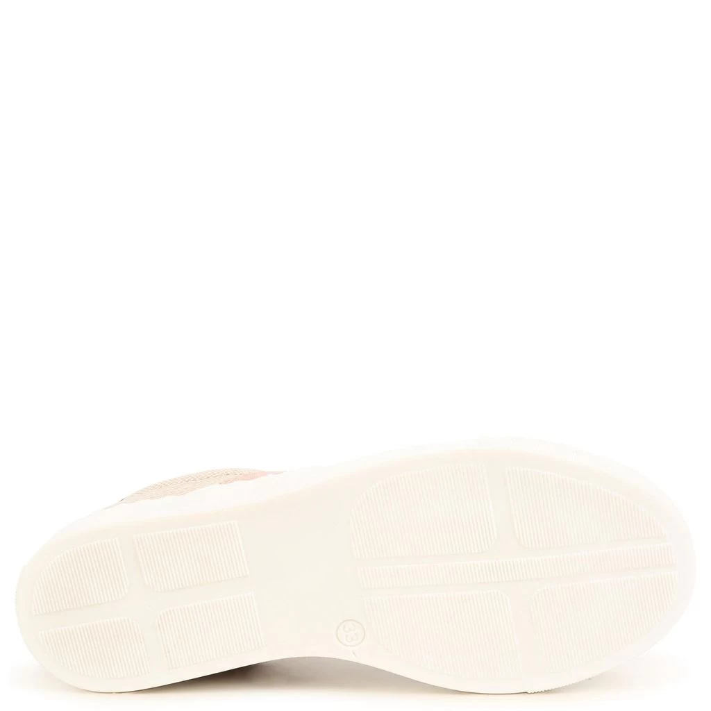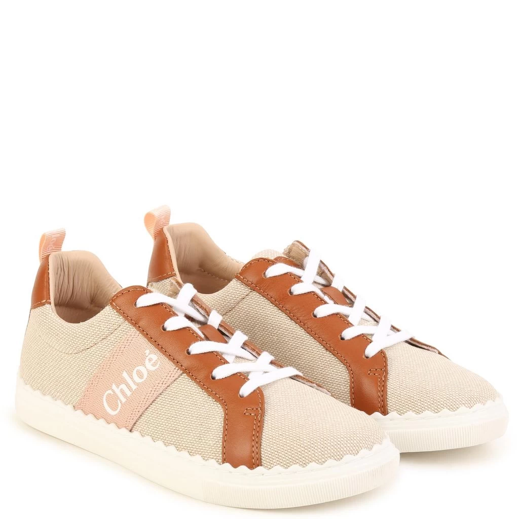 Kids’ sneakers that look and feel great. Beige sneakers by Chloé. The sneakers are made in Portugal and have a canvas upper with leather details.