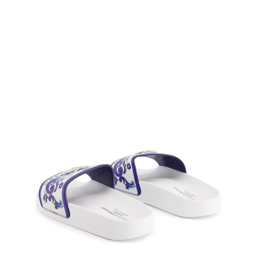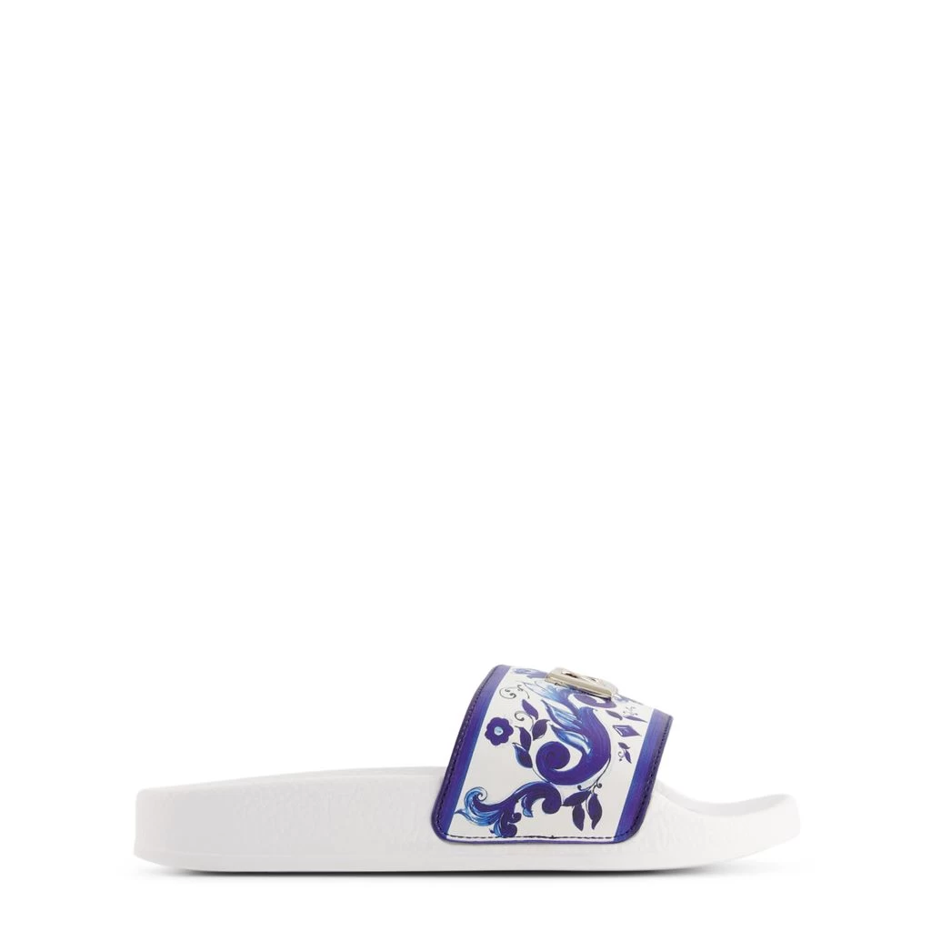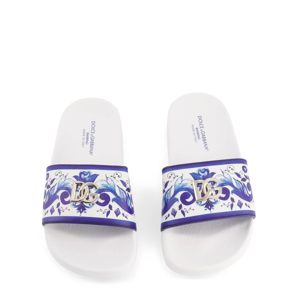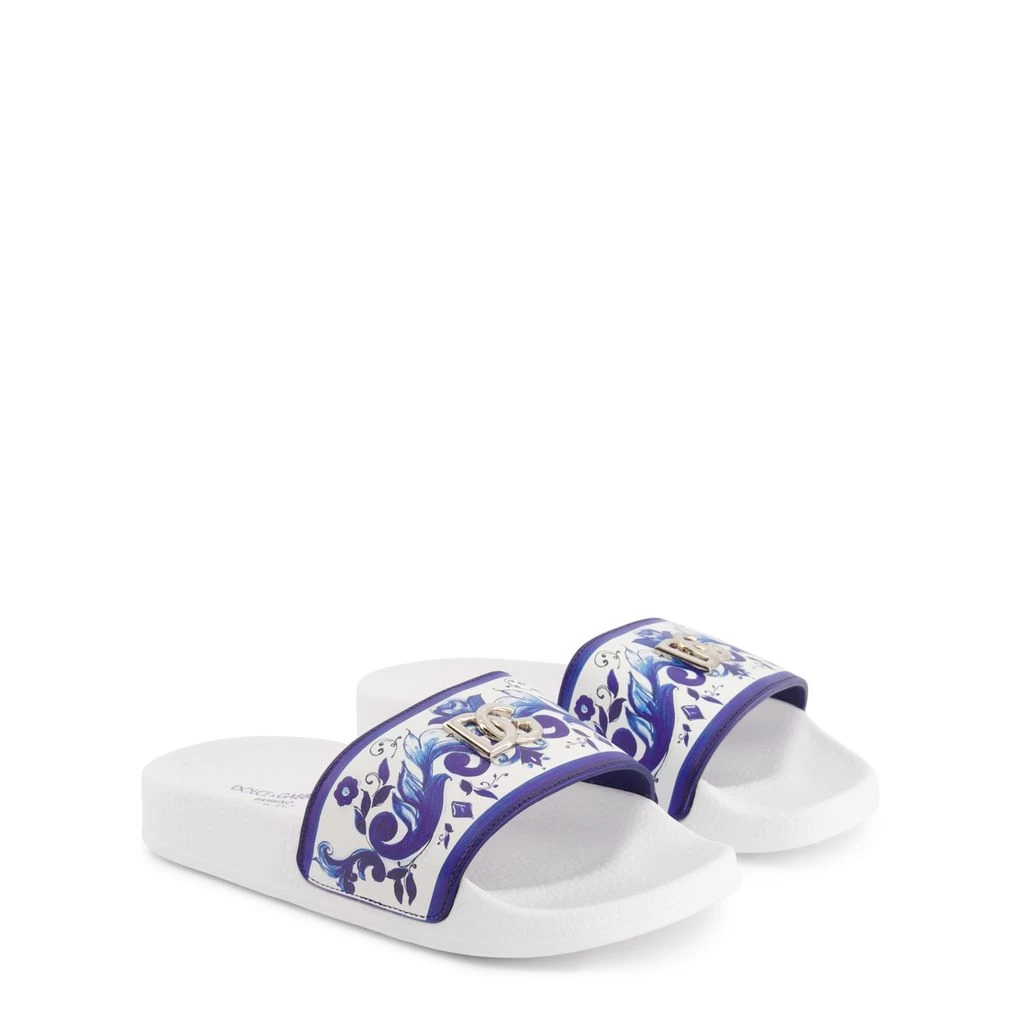Enjoy the day in style. Blue slide sandals by Dolce & Gabbana. The slide sandals are made in Italy and have branding on the front.