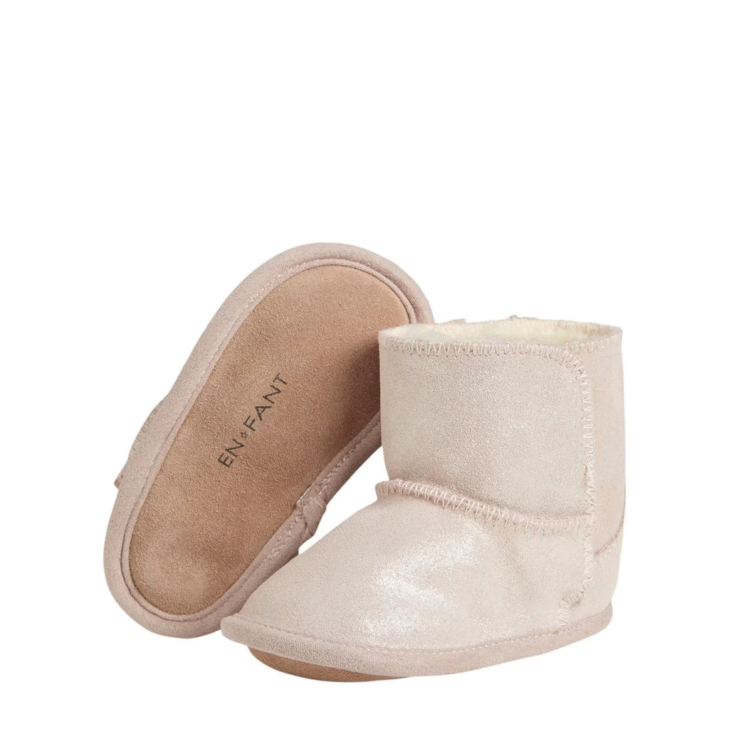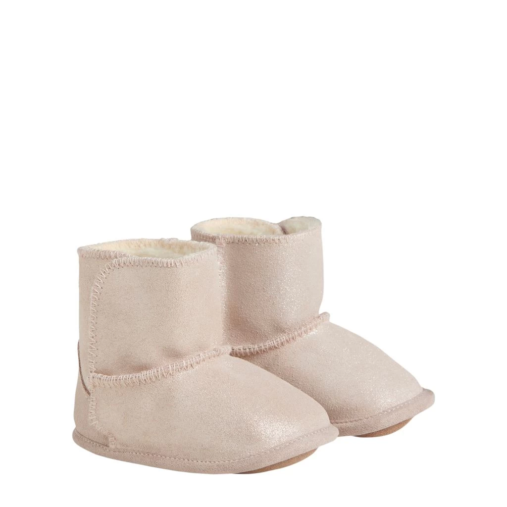 Little feet will be super comfy. Pink booties by EnFant. The booties have a glittery suede upper.