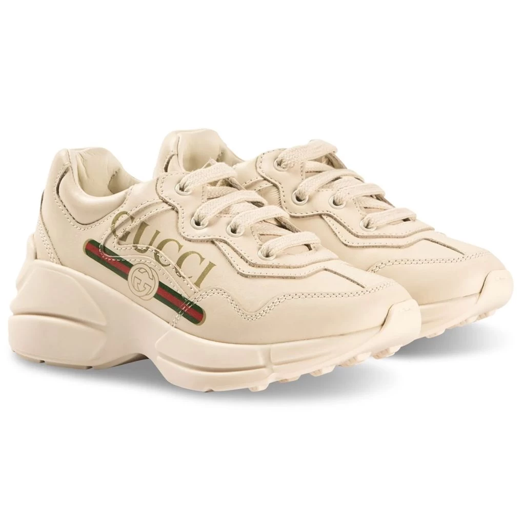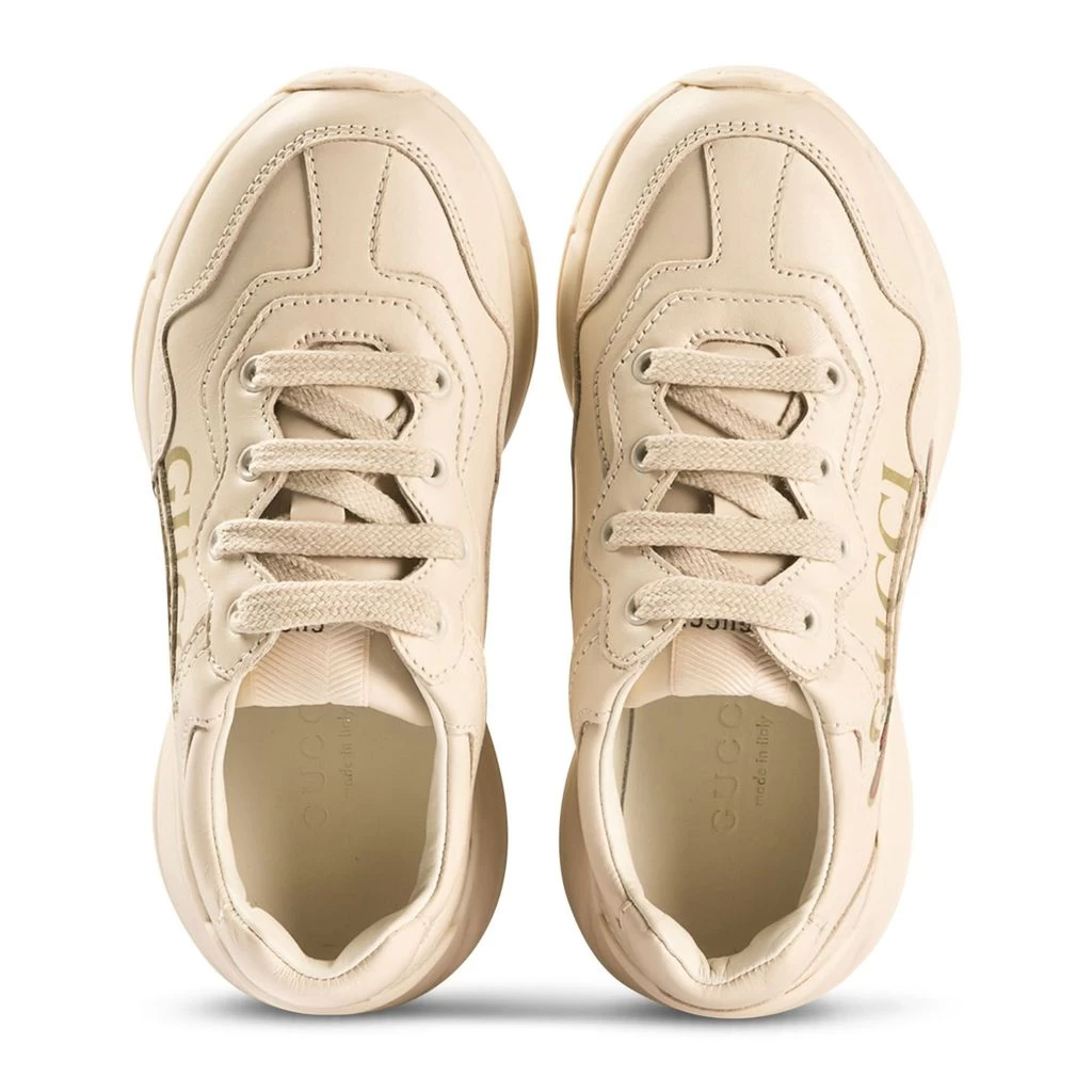 Kids’ sneakers that look and feel great. Beige Rhyton sneakers by Gucci. The sneakers are made in Italy and have a leather upper.