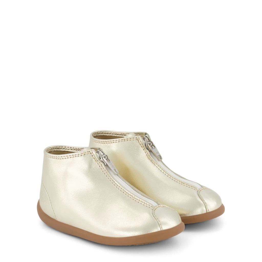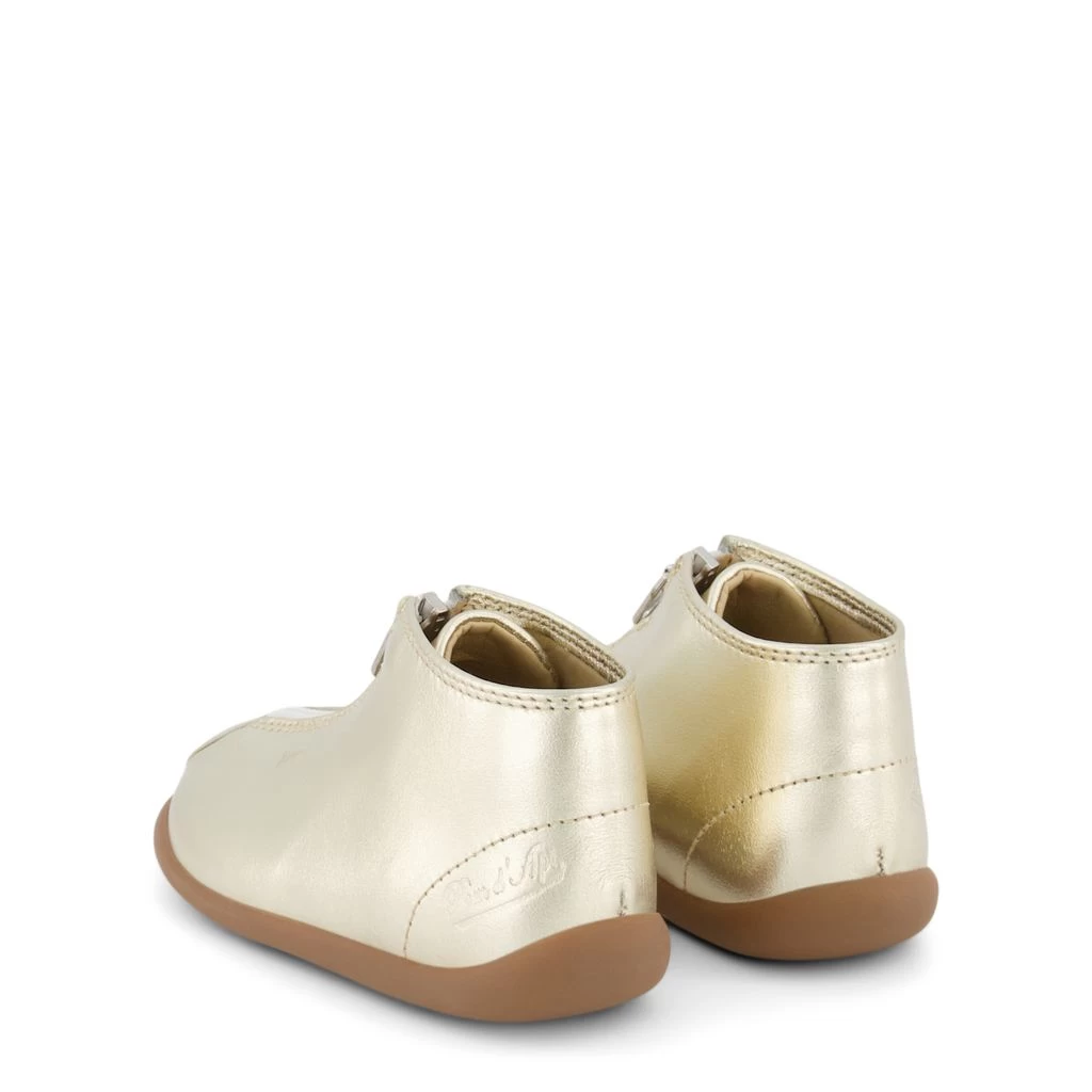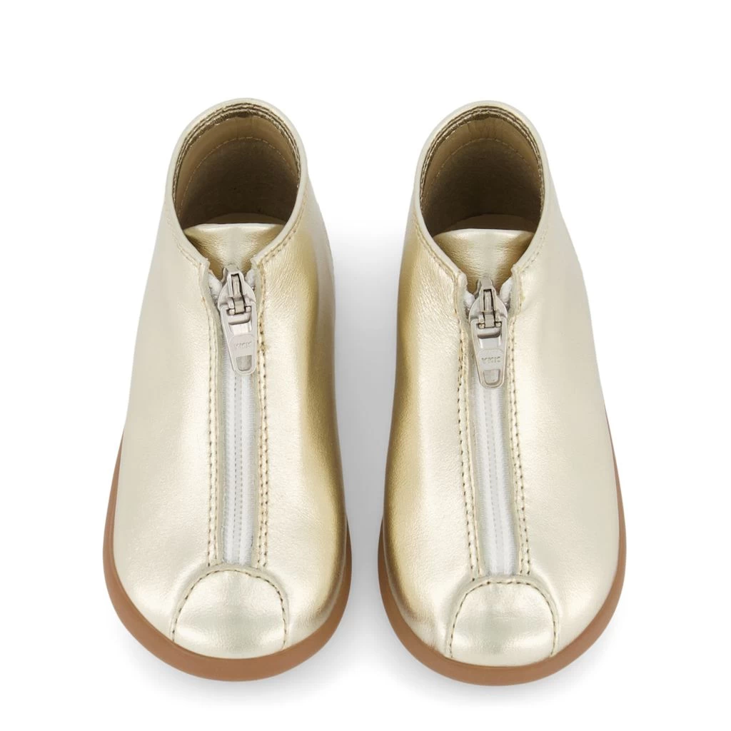 Gold Home Zip shoes by Pom d’Api. The shoes have a leather upper.