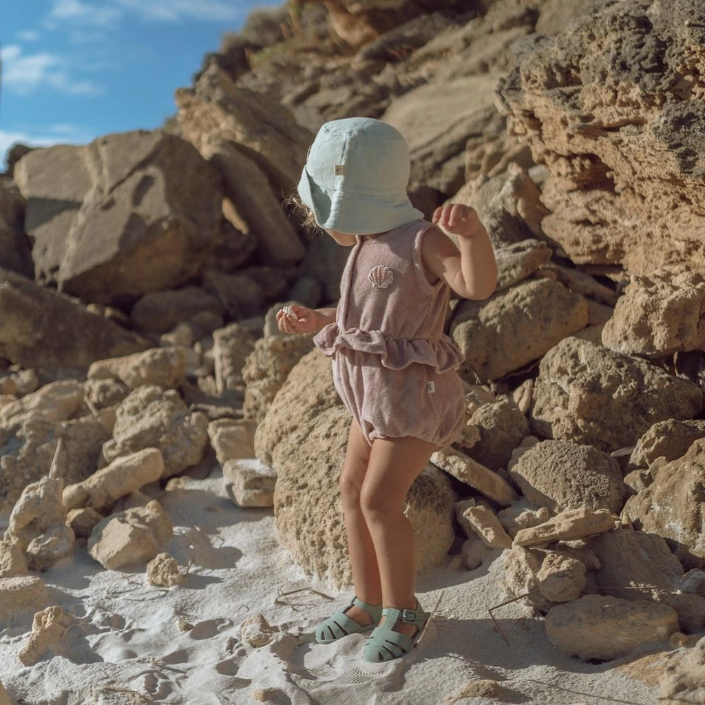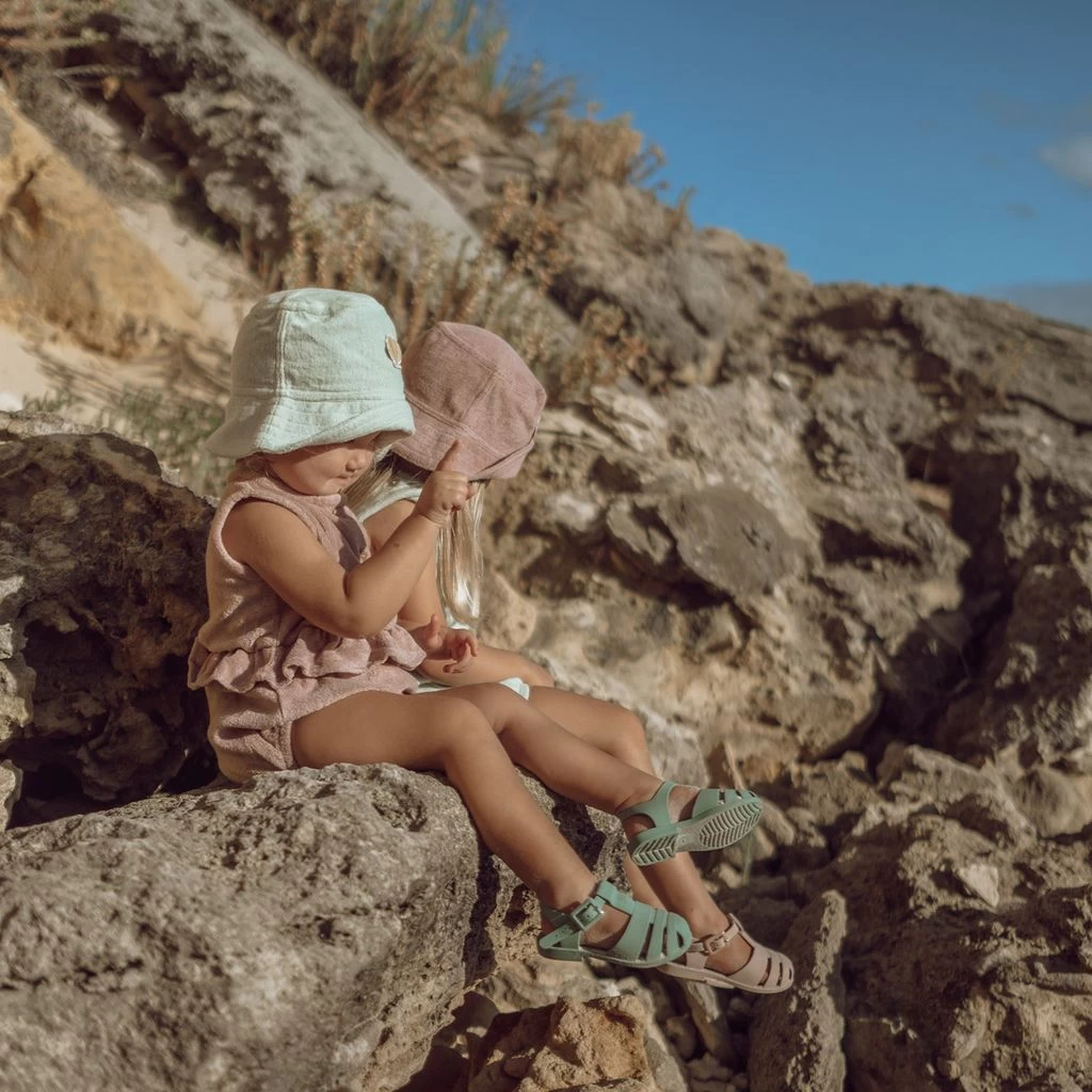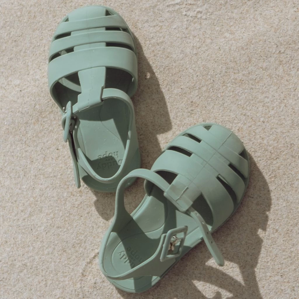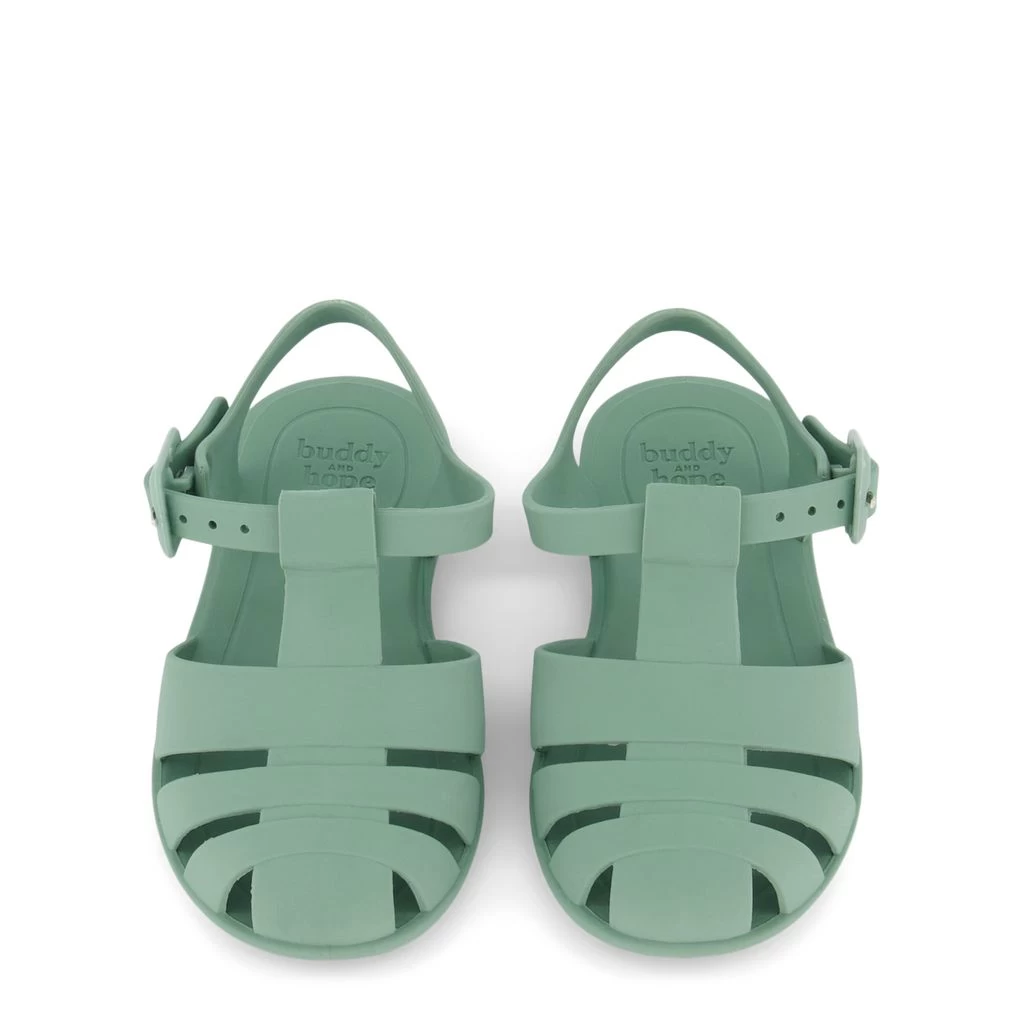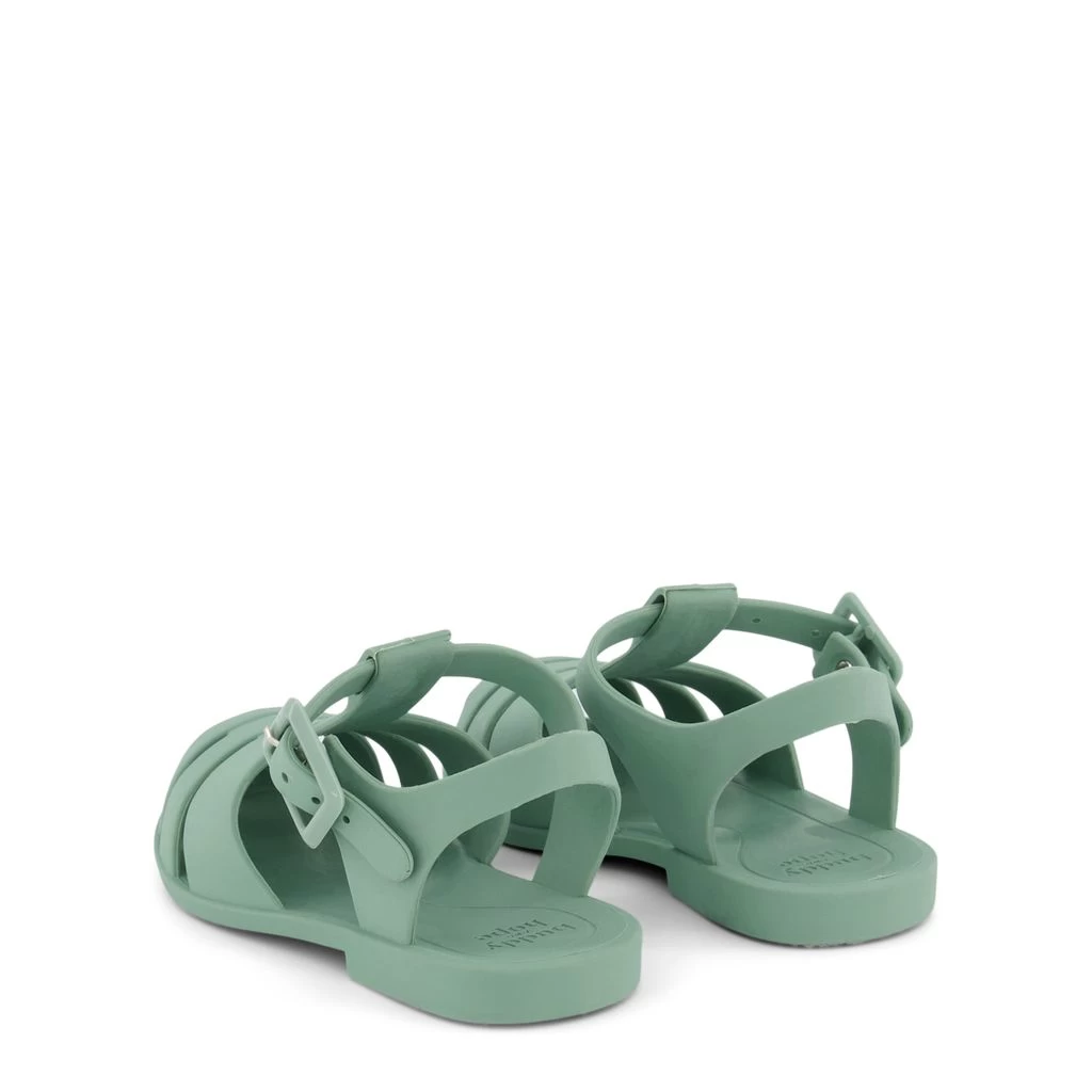 Little feet will be ready for the beach. Green Kim sandals by Buddy & Hope. The sandals have a flexible design.