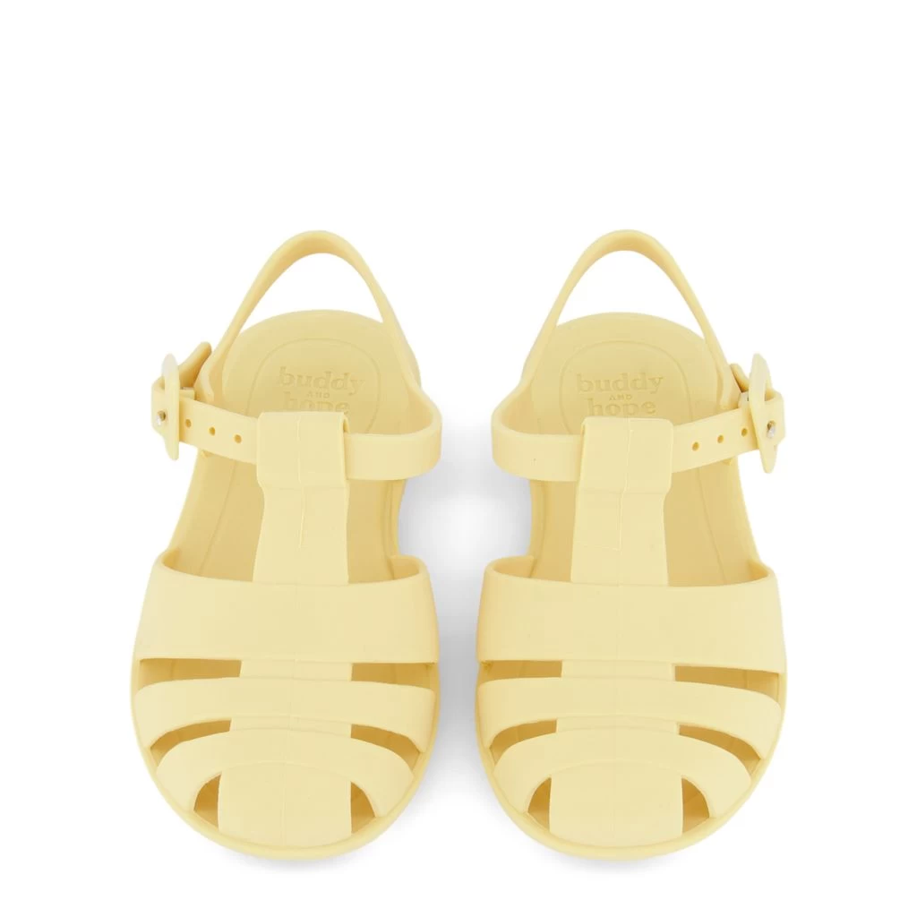 Little feet will be ready for the beach. Yellow Kim sandals by Buddy & Hope. The sandals have a flexible design.