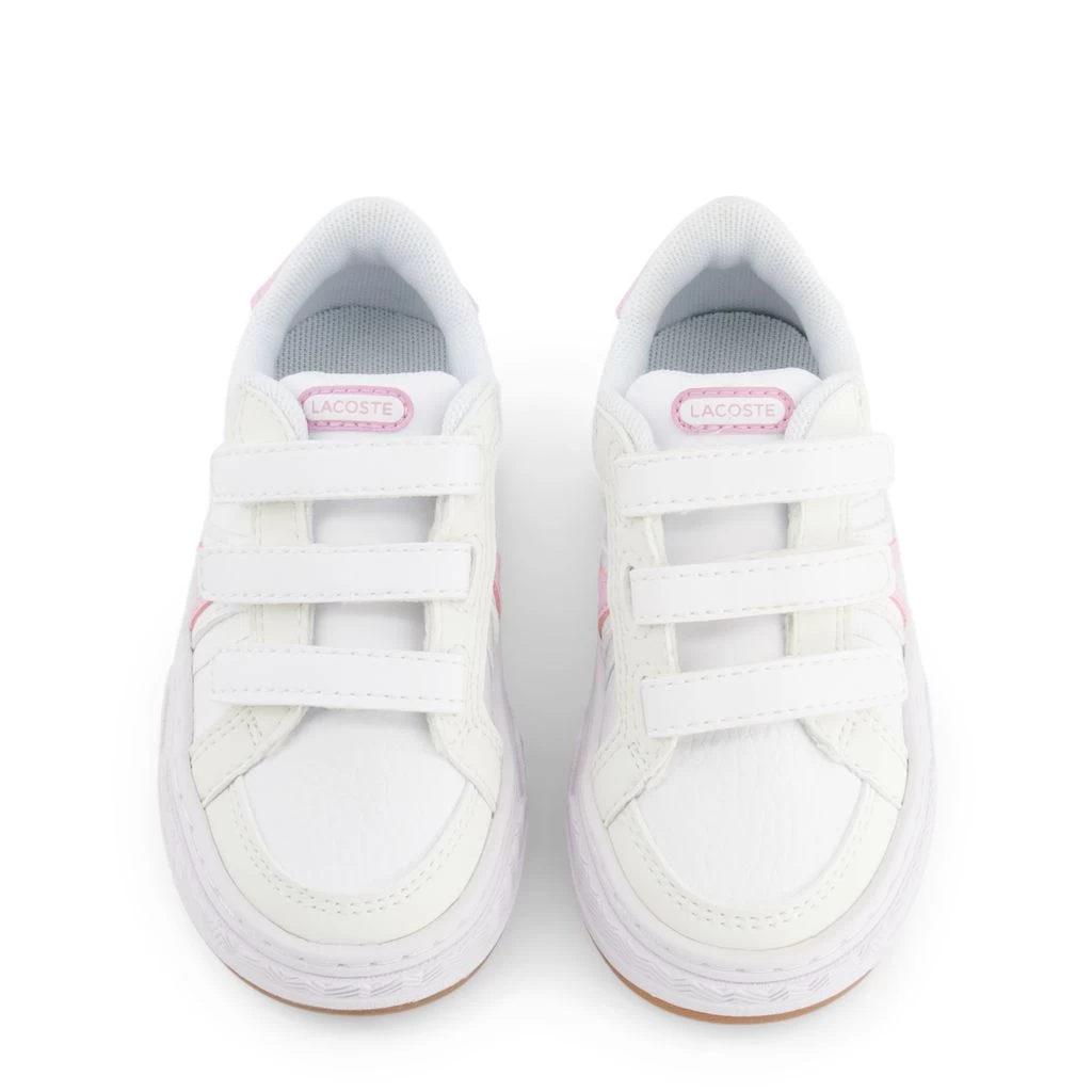 Kids’ sneakers that look and feel great. White sneakers by Lacoste. The sneakers have velcro closures for easy on and off.