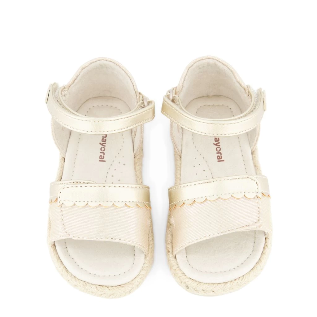 The perfect summertime look. Gold sandals by Mayoral. The sandals have velcro closures for easy on and off.