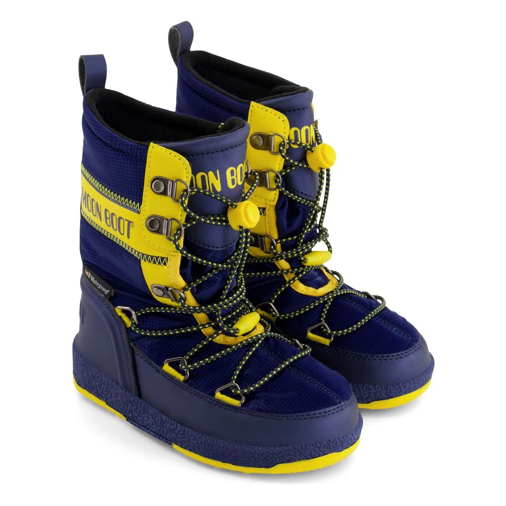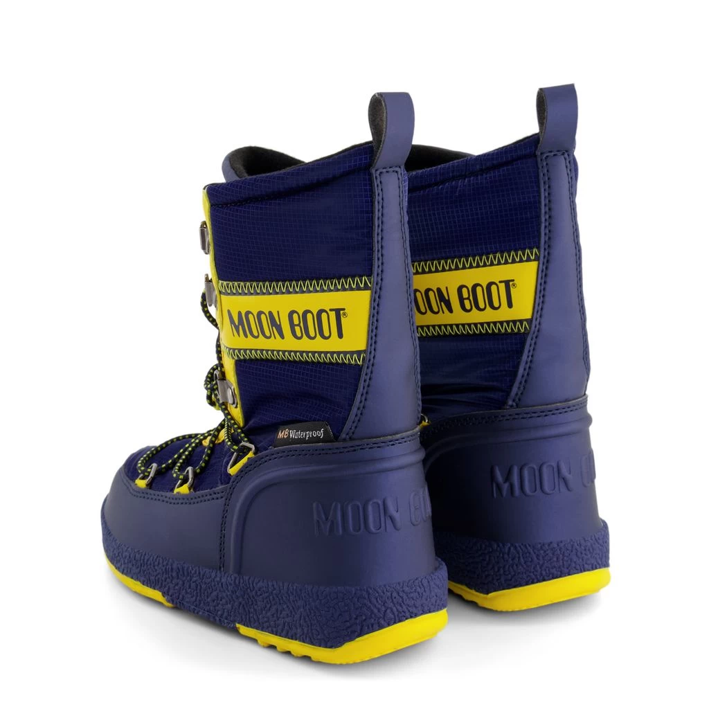 Get ready for the next snowball fight!. Blue snow boots by Moon Boot. The boots have a round toe.