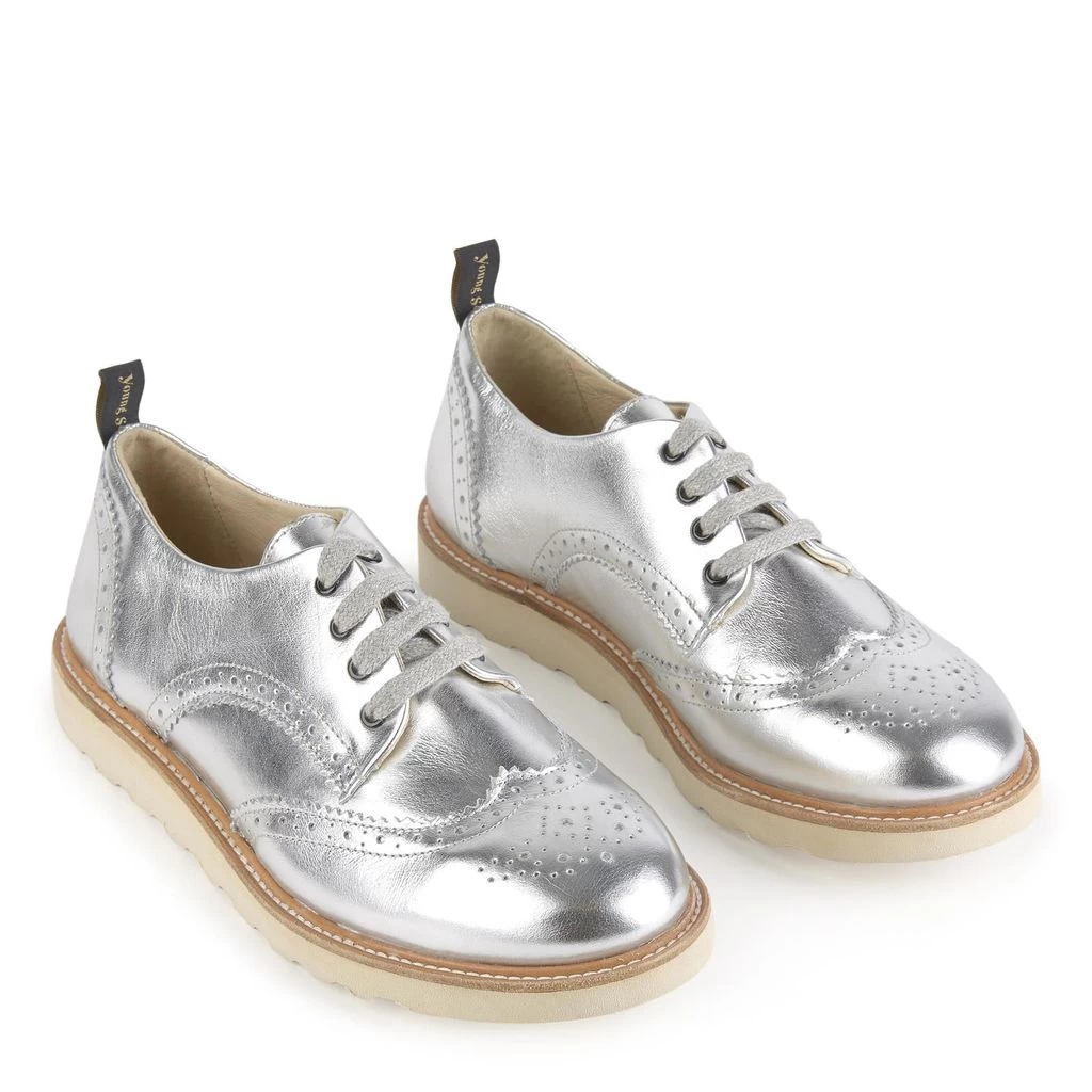 Leather upper, Leather insoles, Super light EVA outsoles, Stylish item, A must-have accessory for special occasions, Strengthening patches on the heels, Stitched seams on the soles, Shoe laces to tie on the front, Silver gleams, Silver effect, Micro-perforated patterns