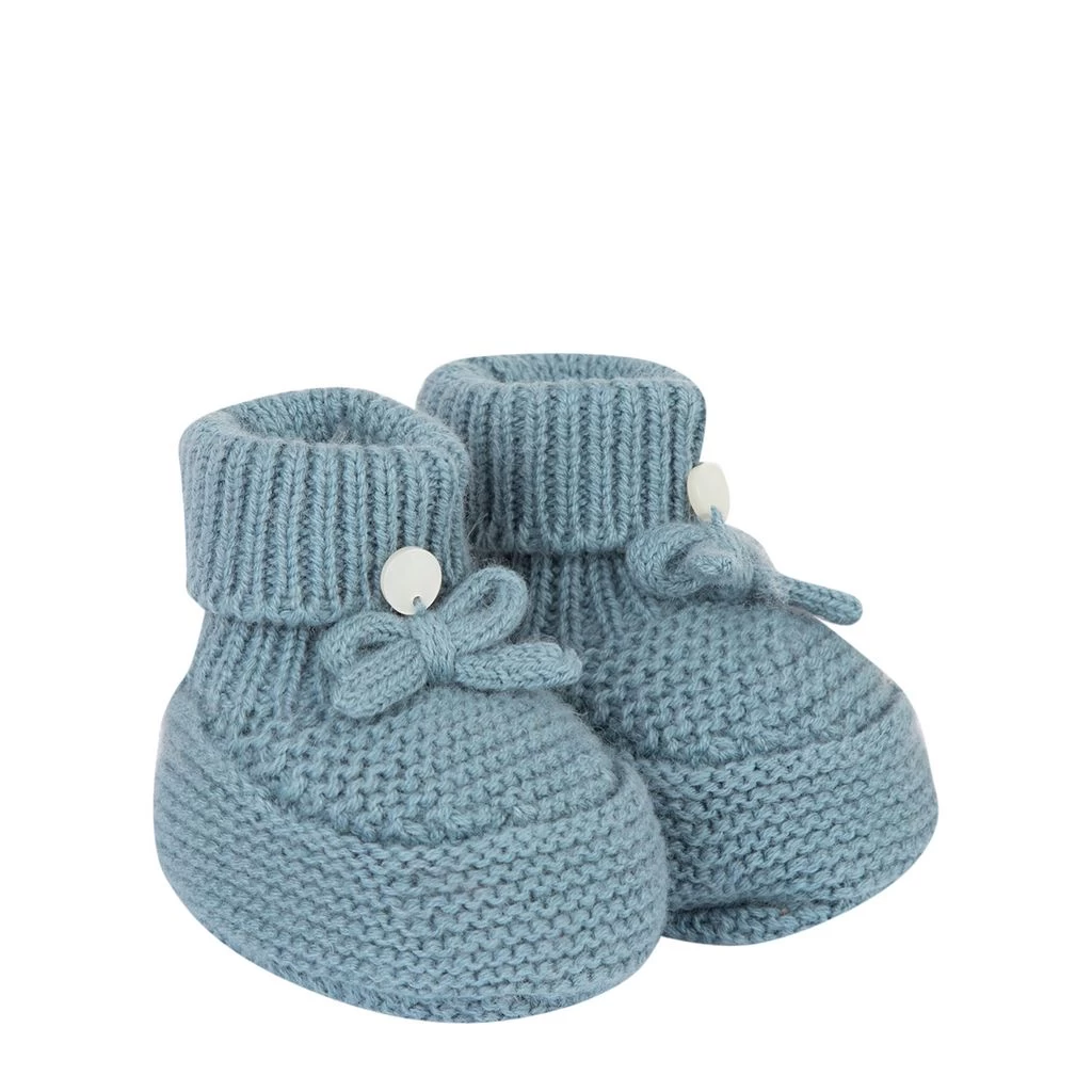 Keep little feet warm. Blue booties by Tartine et Chocolat. The booties have a knitted design.