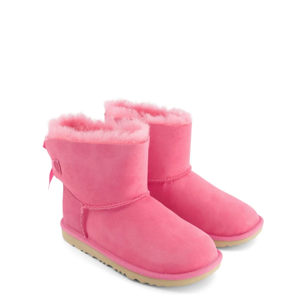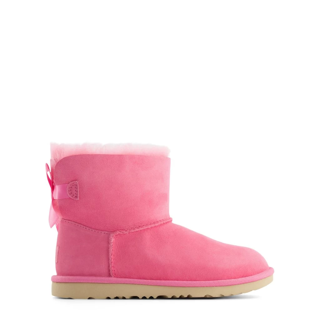 Be warm and comfy on winter adventures. Pink Mini Bailey Bow II snow boots by UGG. The boots have a leather upper.