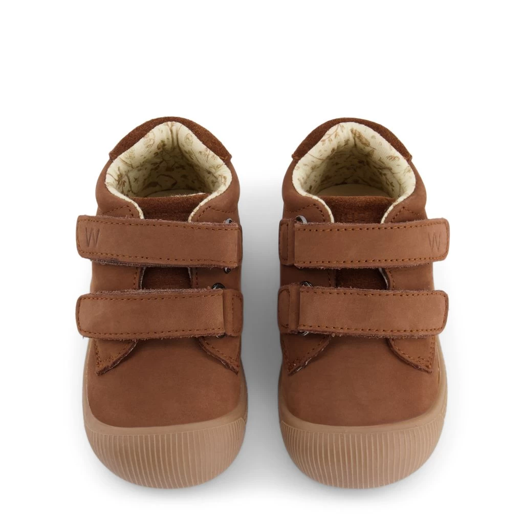 Little feet can walk in style. Brown Keita shoes by Wheat. The shoes have velcro closures for easy on and off.