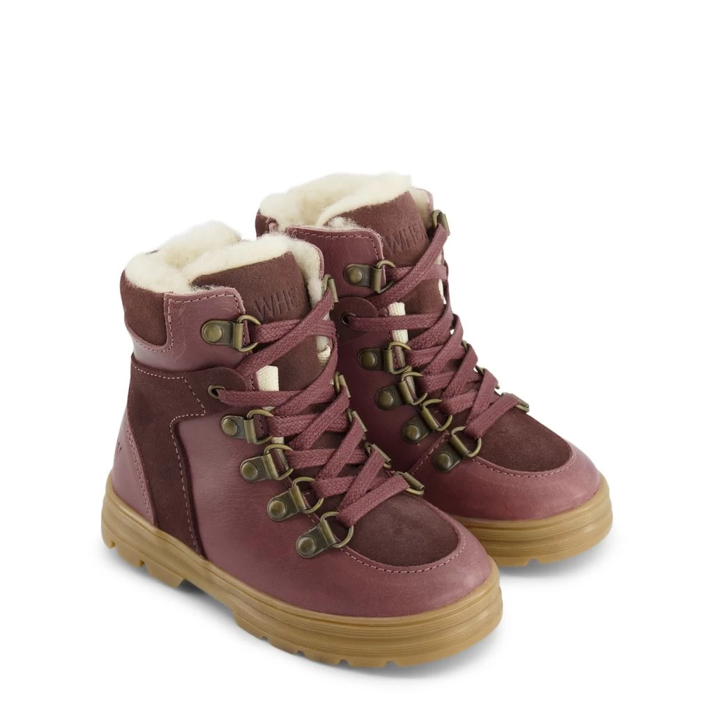 Play outside anytime!. Purple Toni boots by Wheat. The boots are made in Portugal and have a leather upper.