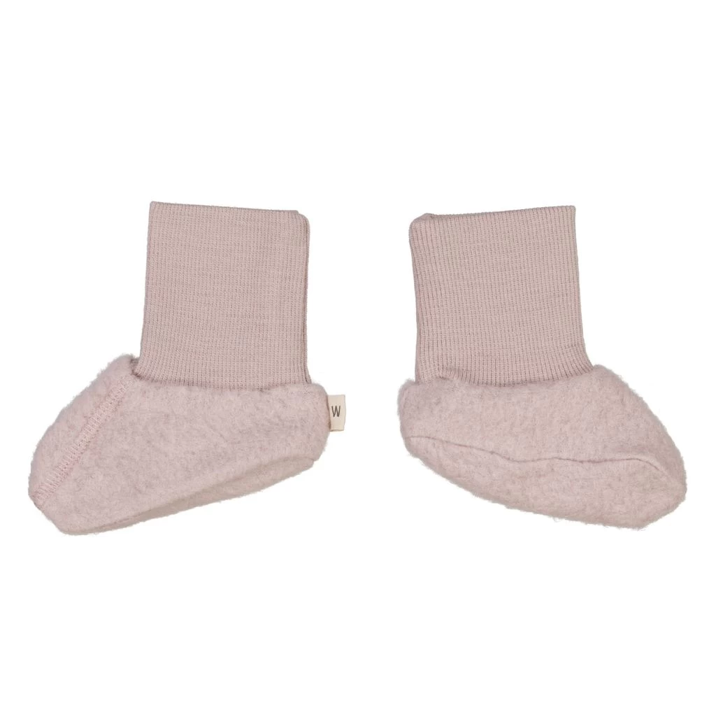 Little feet will be super comfy. Pink booties by Wheat. The booties have ribbed, folded cuffs.